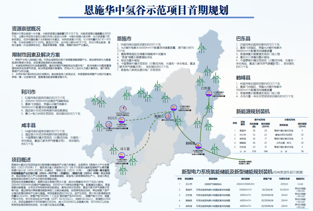 项目位于湖北省恩施州2市3县,正申报国家氢能试点示范项目,规划新建风光电站180万千瓦、新型储能电站40万千瓦/140万千瓦时,年产绿氢20万吨,绿氢应用于交通、能源及化工(合成氨)领域。