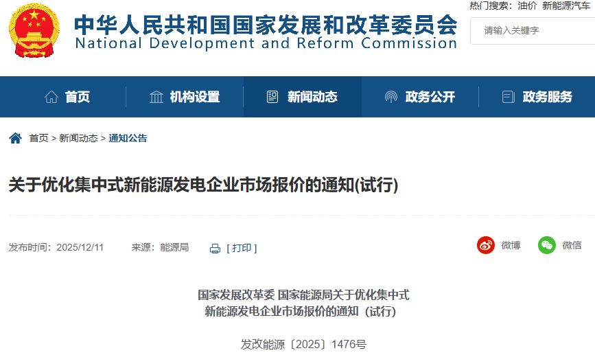 氢能汇获悉,12月11日,国家发展改革委、国家能源局发布关于优化集中式新能源发电企业市场报价的通知(试行)。