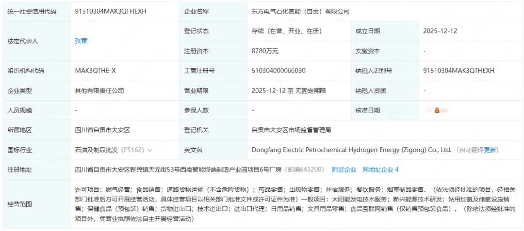 氢能汇获悉,12月12日,东方电气石化氢能(自贡)有限公司成立,注册资本为8780万元,法定代表人为张章,企业注册地址位于四川省自贡市大安区新民镇天元街53号西南智能终端制造产业园项目6号厂房,所属行业为批发业。