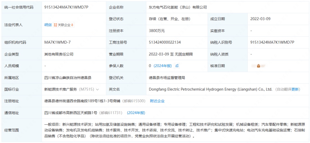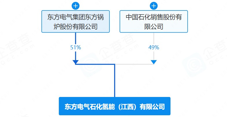 2022年3月9日,双方合资成立东方电气石化氢能(凉山)有限公司,注册资本3800万元,经营范围包含:新兴能源技术研发;站用加氢及储氢设施销售;新能源原动设备销售;发电机及发电机组销售;集中式快速充电站;电动汽车充电基础设施运营等。
