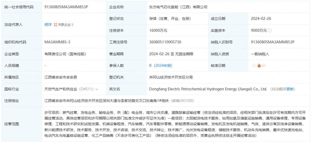 2024年2月26日,合资成立东方电气石化氢能(江西)有限公司,注册资本为16000万元,经营范围包含:太阳能发电技术服务,站用加氢及储氢设施销售,新能源原动设备销售,光伏发电设备租赁,储能技术服务,机动车充电销售,集中式快速充电站,电动汽车充电基础设施运营等。