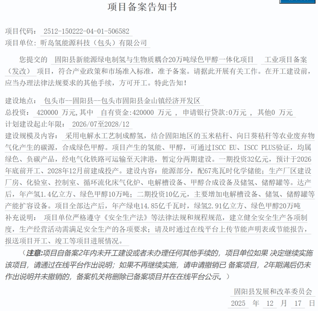 氢能汇获悉,近日,固阳县新能源绿电制氢与生物质耦合20万吨绿色甲醇一体化项目获备案。