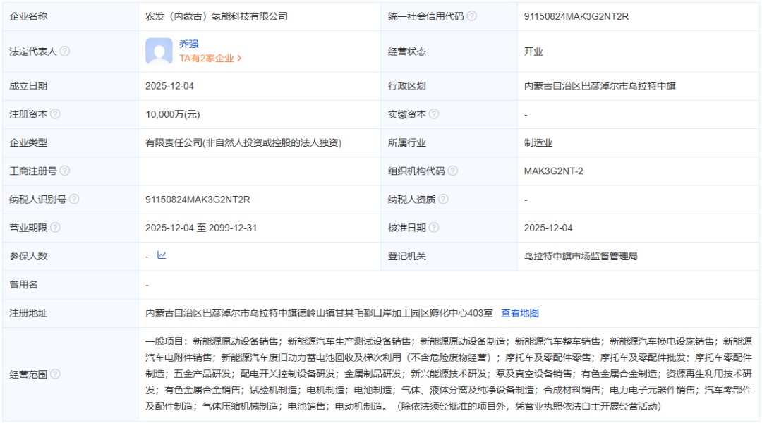 氢能汇获悉,农发(内蒙古)氢能科技有限公司于12月4日成立,注册资本10000万元,法定代表人为乔强,位于内蒙古自治区巴彦淖尔市。
