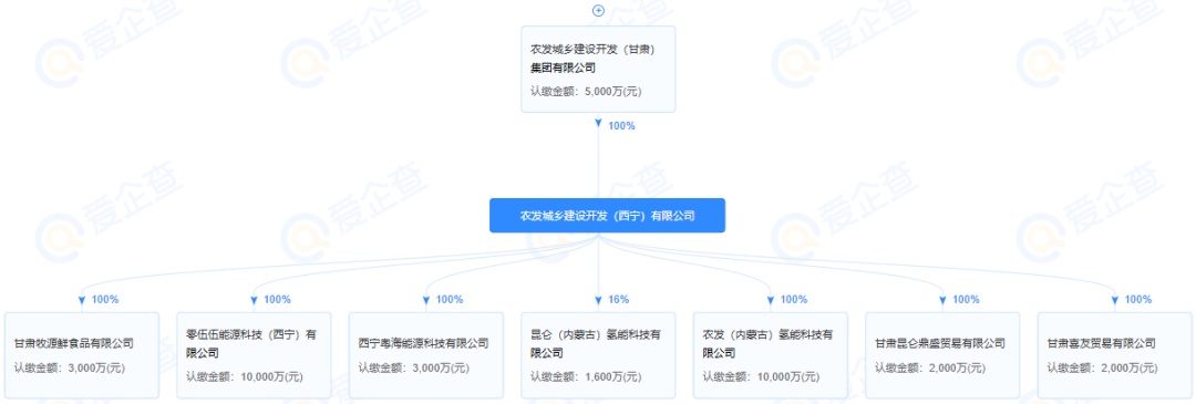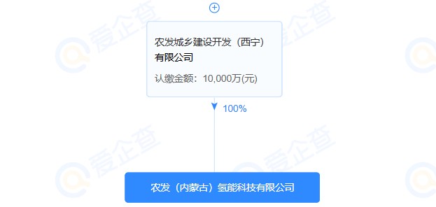 股权穿透显示,农发(内蒙古)氢能科技有限公司由农发城乡建设开发(西宁)有限公司全资控股。农发城乡建设开发(西宁)有限公司由农发城乡建设开发(甘肃)集团有限公司全资控股,均为中国农业产业发展基金有限公司旗下公司。