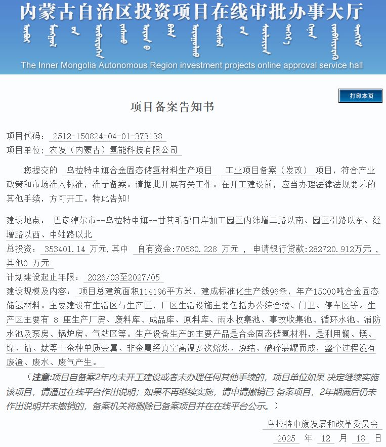 据了解,2025年12月18日,农发(内蒙古)氢能科技有限公司投资建设的乌拉特中旗合金固态储氢材料生产项目获备案。