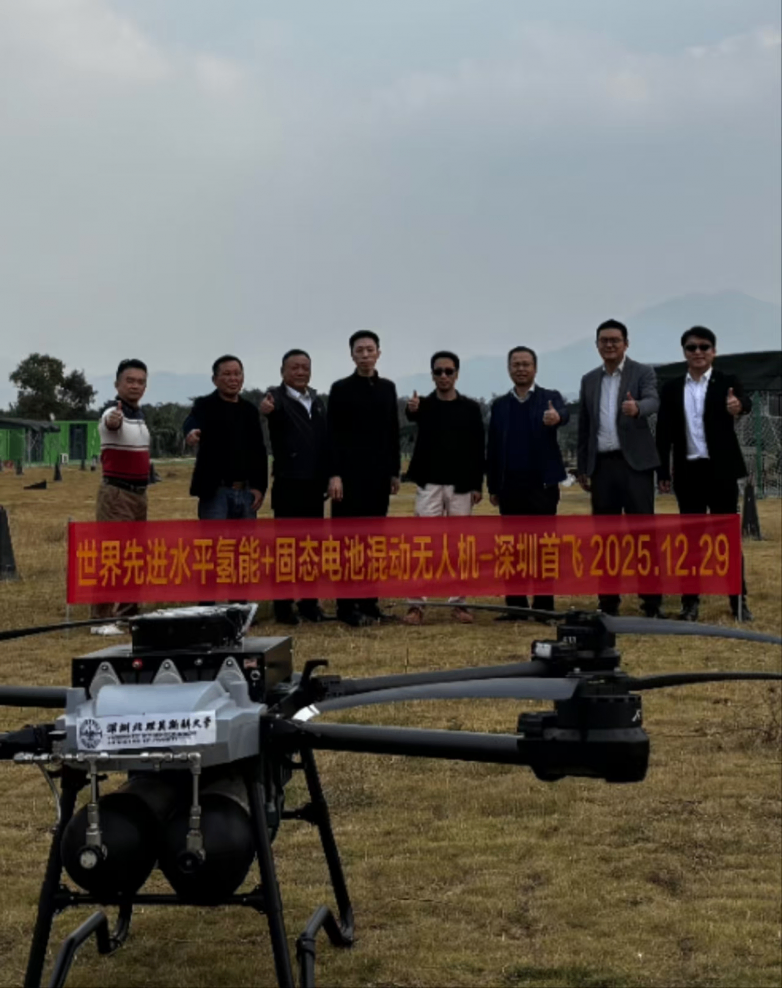 2025年12月29日,具备世界先进水平的氢能+固态电池混动四旋翼无人机"青深一号"在深圳全球鹰无人机飞行基地完成首飞。该无人机最大起飞重量105公斤,最大净载重超过10公斤,搭载双燃料电池电堆(单堆功率6kW),配备两枚20升氢气瓶,滞空时间超过90分钟,飞行高度480米,适用海拔5000米以下环境,全程零碳排放,仅排放纯净水。这是氢燃料电池与固态锂电池混合动力技术的创新尝试。该型无人机经过多次系统改造与调试,于2025年年底完成正式首飞。