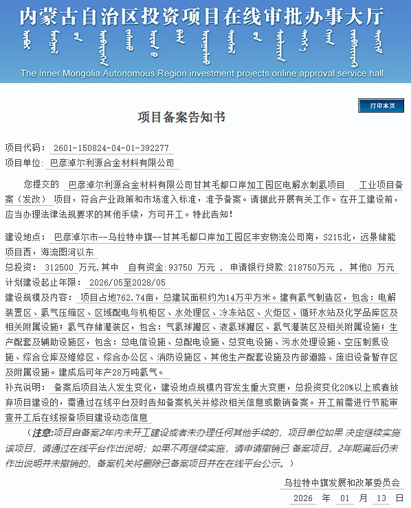 氢能汇获悉,近日,巴彦淖尔利源合金材料有限公司甘其毛都口岸加工园区电解水制氢项目获备案。