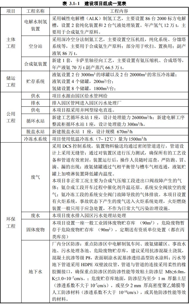 建设内容:建设2万吨/年电解水制氢装置生产线6条年产12万吨绿氢、70万吨/年合成氨装置生产线1条年产70万吨绿氨、560000KNm³/年制氮装置生产线1条、电解槽厂房6座、办公楼1座、循环水站1座、中央控制室1座、液氨罐区1座、氢气罐区1座、脱盐水站1座及配套设施,总建筑面积127083.72平方米。占地面积:占地面积330883㎡。施工期为12个月。
