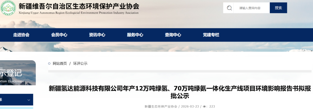 氢能汇获悉,3月23日,新疆氢达能源科技有限公司年产12万吨绿氢、70万吨绿氨一体化生产线项目环境影响报告书拟报批公示。