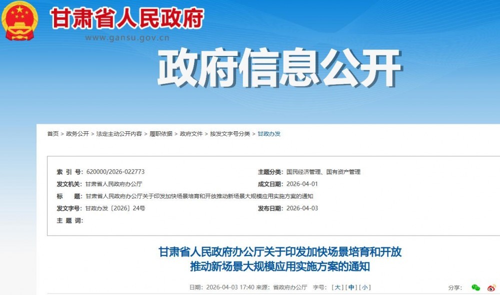 近日,甘肃省人民政府办公厅关于印发加快场景培育和开放推动新场景大规模应用实施方案的通知。