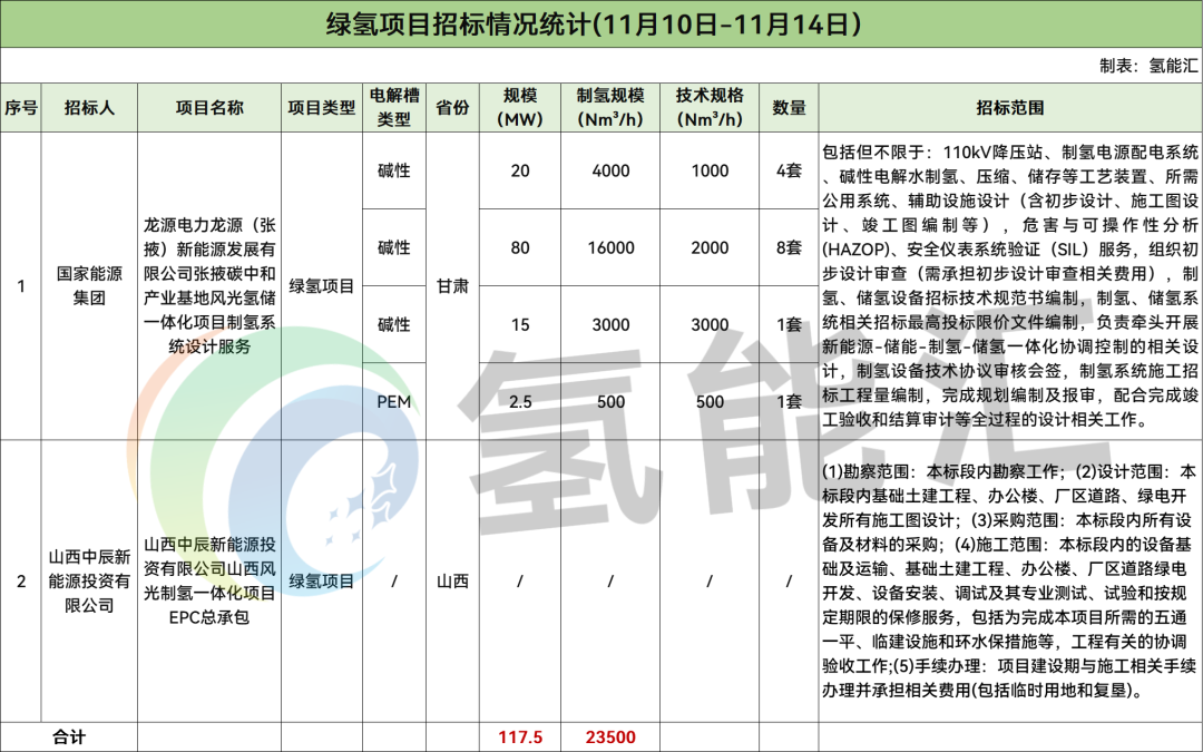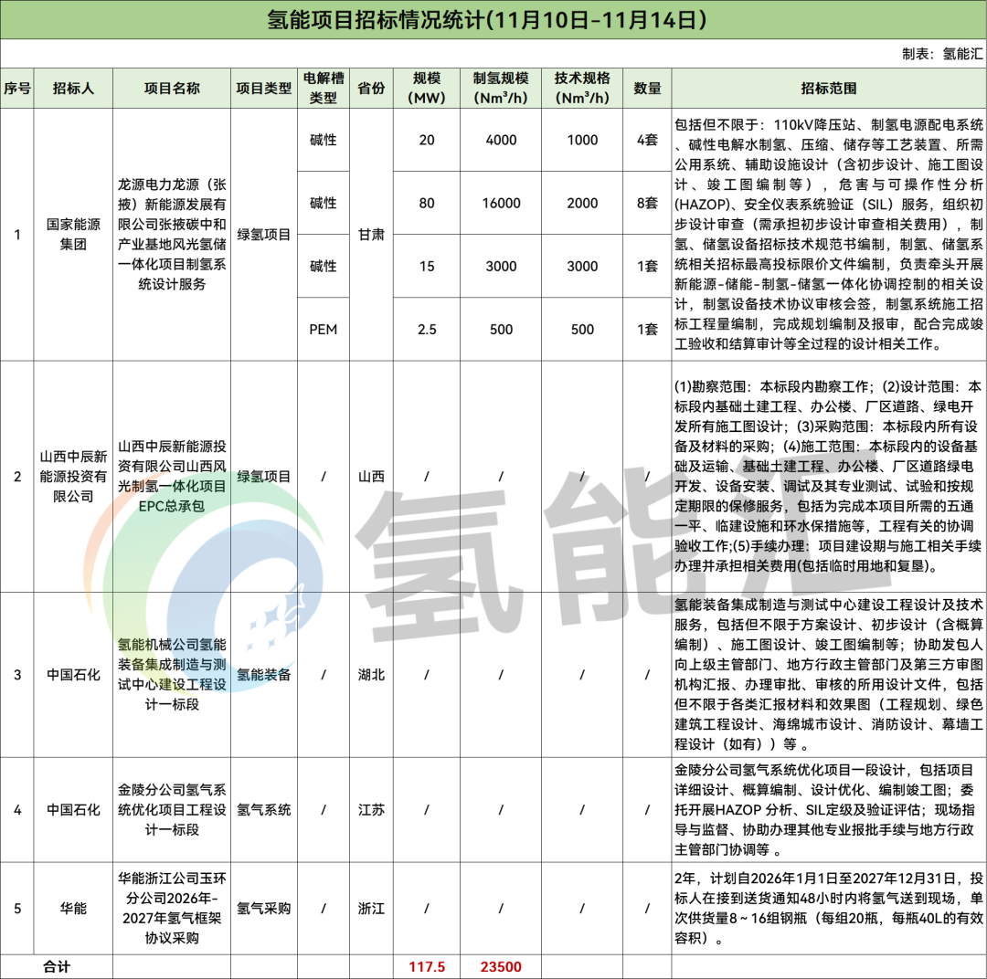 据氢能汇统计,11月10日-11月14日氢能项目招投标方面,累计中标项目有2个;招标项目有5个,规模总计117.5MW,制氢规模总计23500Nm³/h。