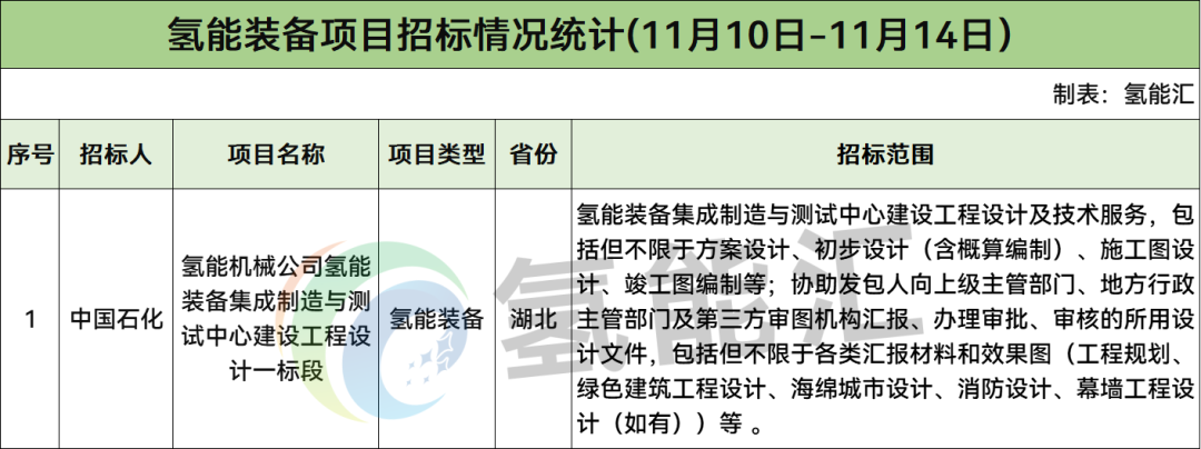 据氢能汇统计,本周1个氢能装备项目招标,项目为氢能机械公司氢能装备集成制造与测试中心建设工程设计一标段,招标人为中国石化。