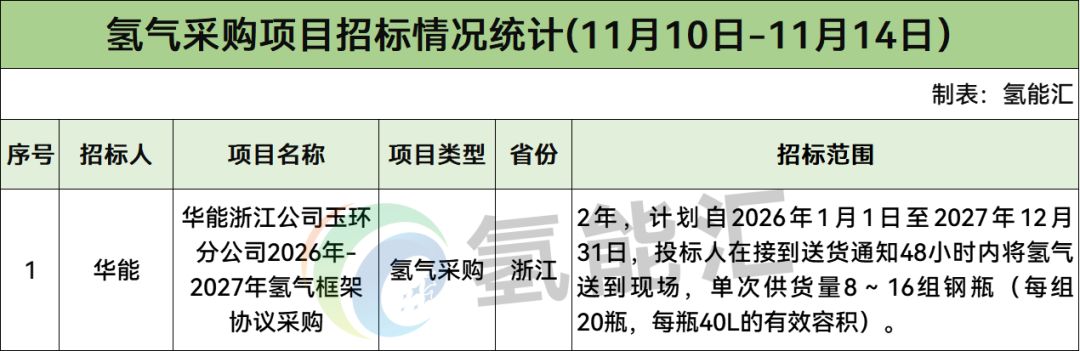 据氢能汇统计,本周1个氢气采购项目招标,项目为华能浙江公司玉环分公司2026年-2027年氢气框架协议采购,招标人为华能。
