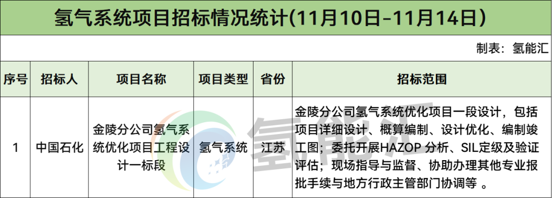 据氢能汇统计,本周1个氢气系统项目招标,项目为金陵分公司氢气系统优化项目工程设计一标段,招标人为中国石化。