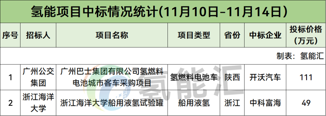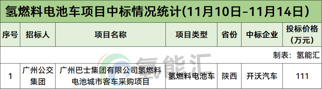 据氢能汇统计,本周1个氢燃料电池车项目开标,项目为广州巴士集团有限公司氢燃料电池城市客车采购项目,由开沃汽车中标,整车中标单价111万元(含税)。