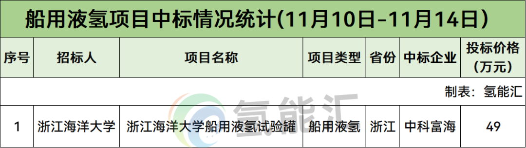 船用液氢项目有1个,招标人为浙江海洋大学,中标企业为中科富海。