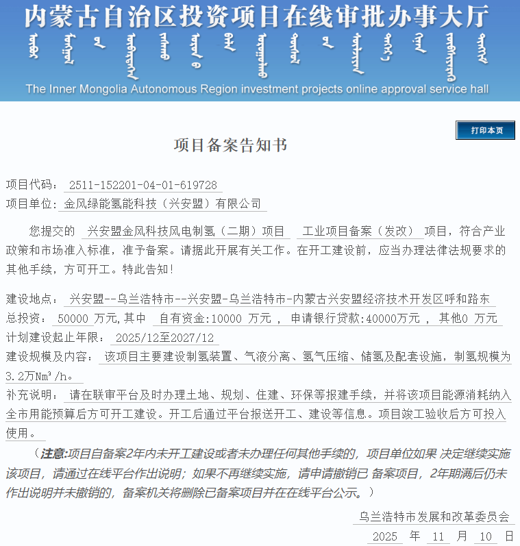 氢能汇获悉,近日,乌兰察布燕煤能源有限公司四子王旗绿氢建设项目、兴安盟金风科技风电制氢(二期)项目获批,项目总投资570000万元。
