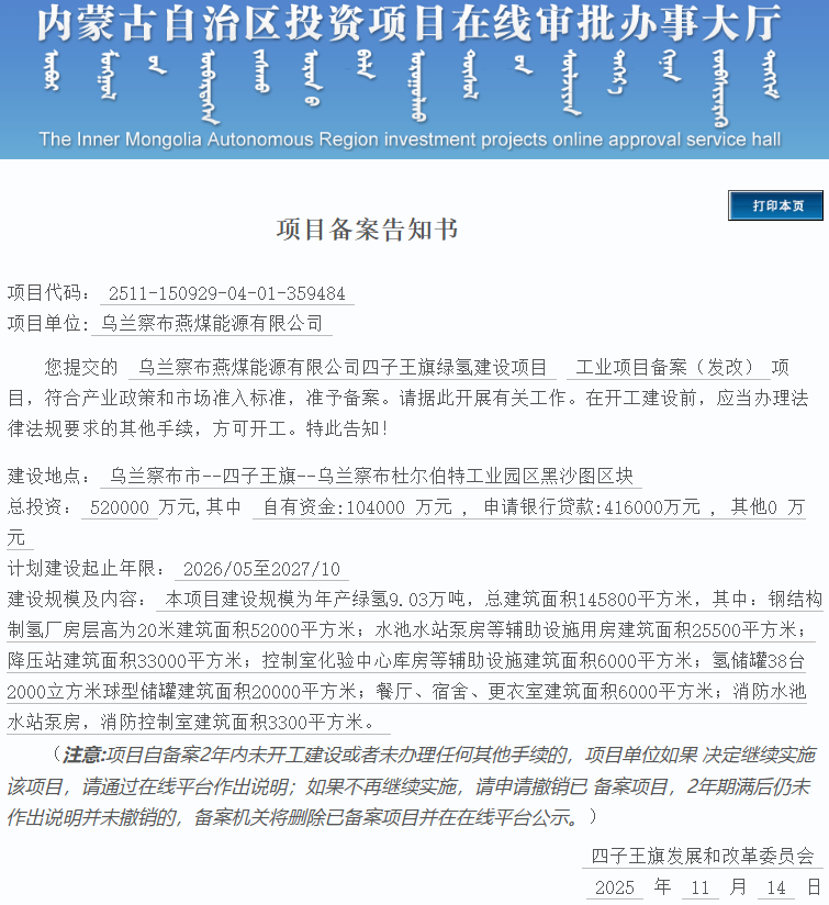 乌兰察布燕煤能源有限公司四子王旗绿氢建设项目位于乌兰察布市--四子王旗--乌兰察布杜尔伯特工业园区黑沙图区块,项目单位为乌兰察布燕煤能源有限公司,总投资520000万元。