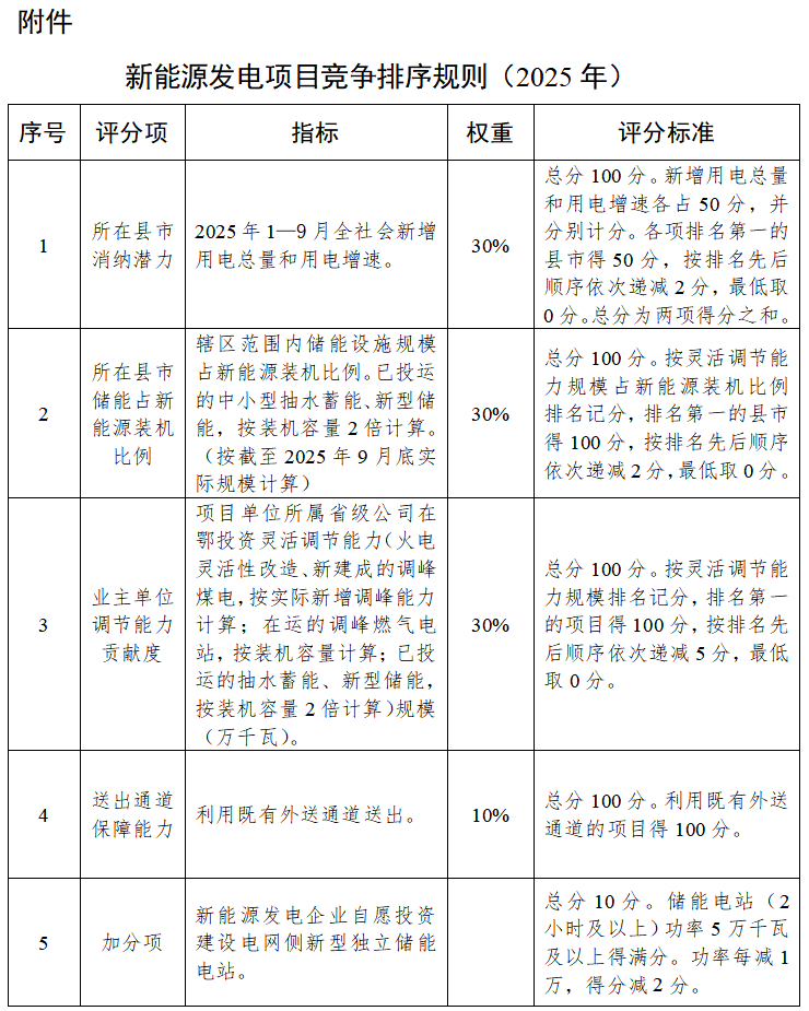 (三)评分排序。省能源局以消纳为导向,按照新能源发电项目竞争排序规则(详见附件),对通过审核的项目组织开展评分排序(加强风光发电资源利用试点项目不参与评分排序)。