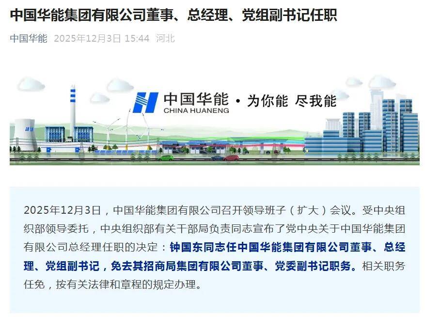 氢能汇获悉,据中国华能微信公众号消息,2025年12月3日,中国华能集团有限公司召开领导班子(扩大)会议。受中央组织部领导委托,中央组织部有关干部局负责同志宣布了党中央关于中国华能集团有限公司总经理任职的决定:钟国东同志任中国华能集团有限公司董事、总经理、党组副书记,免去其招商局集团有限公司董事、党委副书记职务。相关职务任免,按有关法律和章程的规定办理。