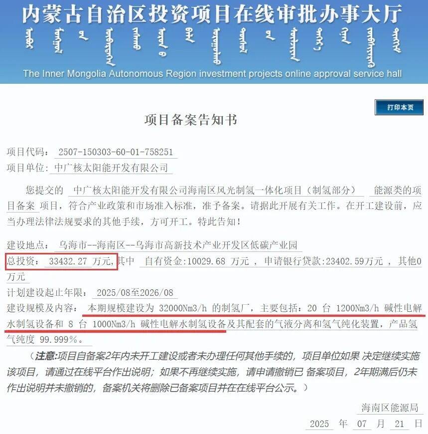 氢能汇获悉,12月3日,中广核太阳能开发有限公司海南区风光制氢一体化项目(制氢部分)变更项目获备案,项目单位、总投资和制氢规模均发生变化。